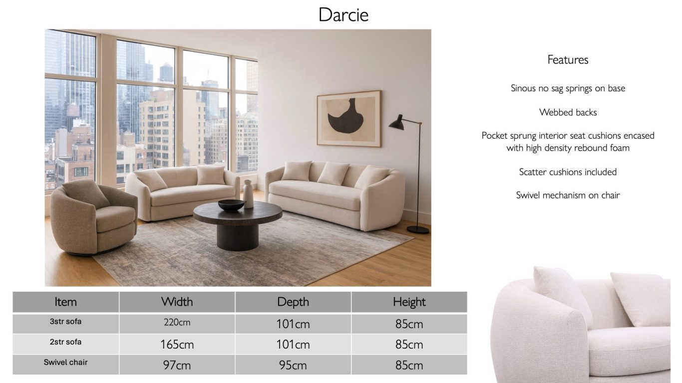 The Darcie range brings a sculptural calm to modern living, defined by its elegant curved sofa silhouette that instantly softens and elevates any space. Each piece invites you to unwind into its gentle contours, complemented by scatter cushions that add layers of texture and effortless style.