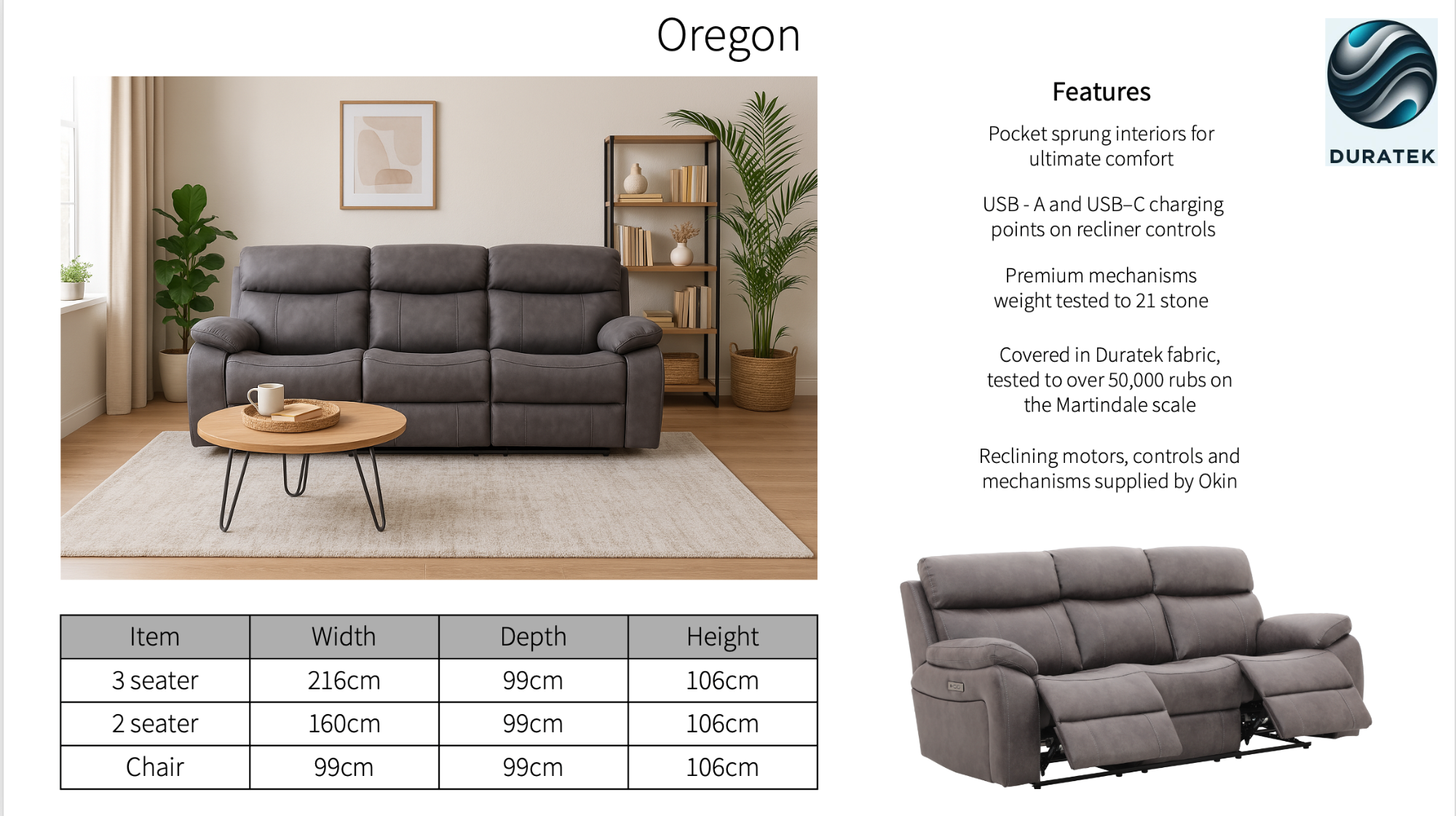 The Oregon range is meticulously designed with ultimate comfort in mind, featuring deep seats equipped with pocket sprung interiors and high backs that provide exceptional support. For those seeking a personalised relaxation experience, the inclusion of electric recliners enhances this comfort to new heights. The upholstery is made from innovative Duratek fabric, renowned for its durability, comfortably exceeding 50,000 rubs on the Martindale scale, making it a perfect choice for both style and resilience in any living space.