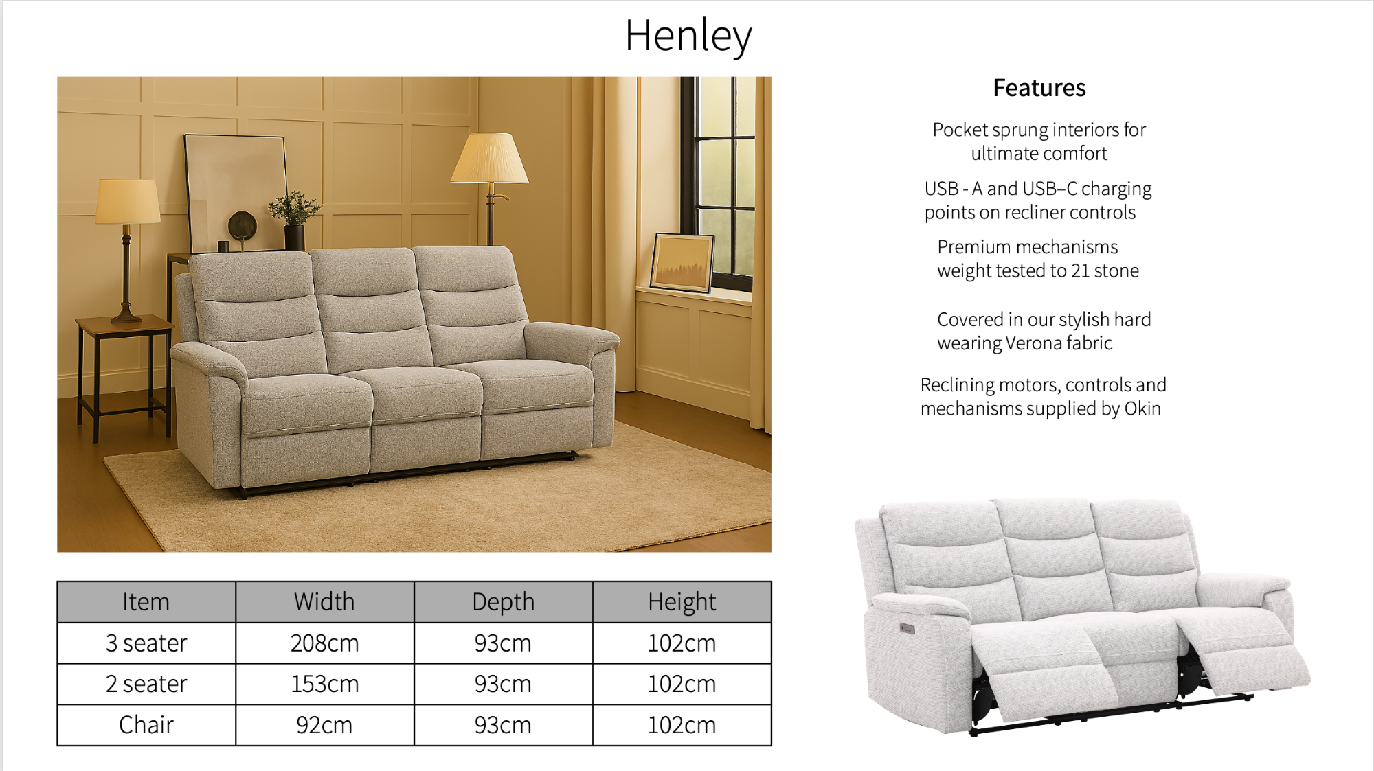 The Henley range is expertly crafted with comfort and support at its core. This exceptional collection features deep seats with pocket sprung interiors that provide unparalleled support, coupled with high backs designed for maximum relaxation. The inclusion of electric recliners enhances the comfort experience, allowing users to find their perfect position effortlessly. Each piece is equipped with premium mechanisms from Okin, meticulously weight tested to accommodate up to 21 stone, ensuring durability and reliability for a superior lounging experience.