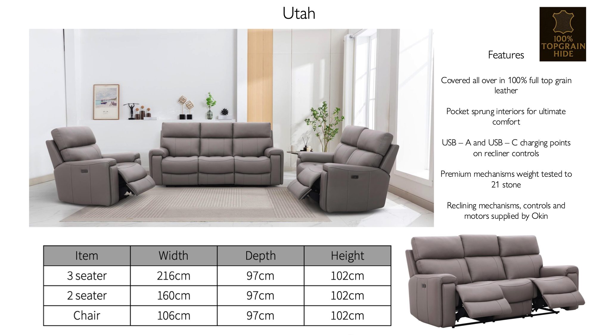 The Utah sofa range epitomises modern comfort and sophisticated design. Each piece features power reclining functions and power headrests so you can find the perfect position for relaxation. Built around a robust Okin mechanism that has been rigorously weight tested to accommodate up to 21 stone, the range delivers exceptional durability and reliable support. Upholstered in 100% full top grain leather all over, the Utah collection offers the genuine look, feel and longevity of premium leather. Recliner controls include both USB‑A and USB‑C charging points, keeping devices powered while you unwind.