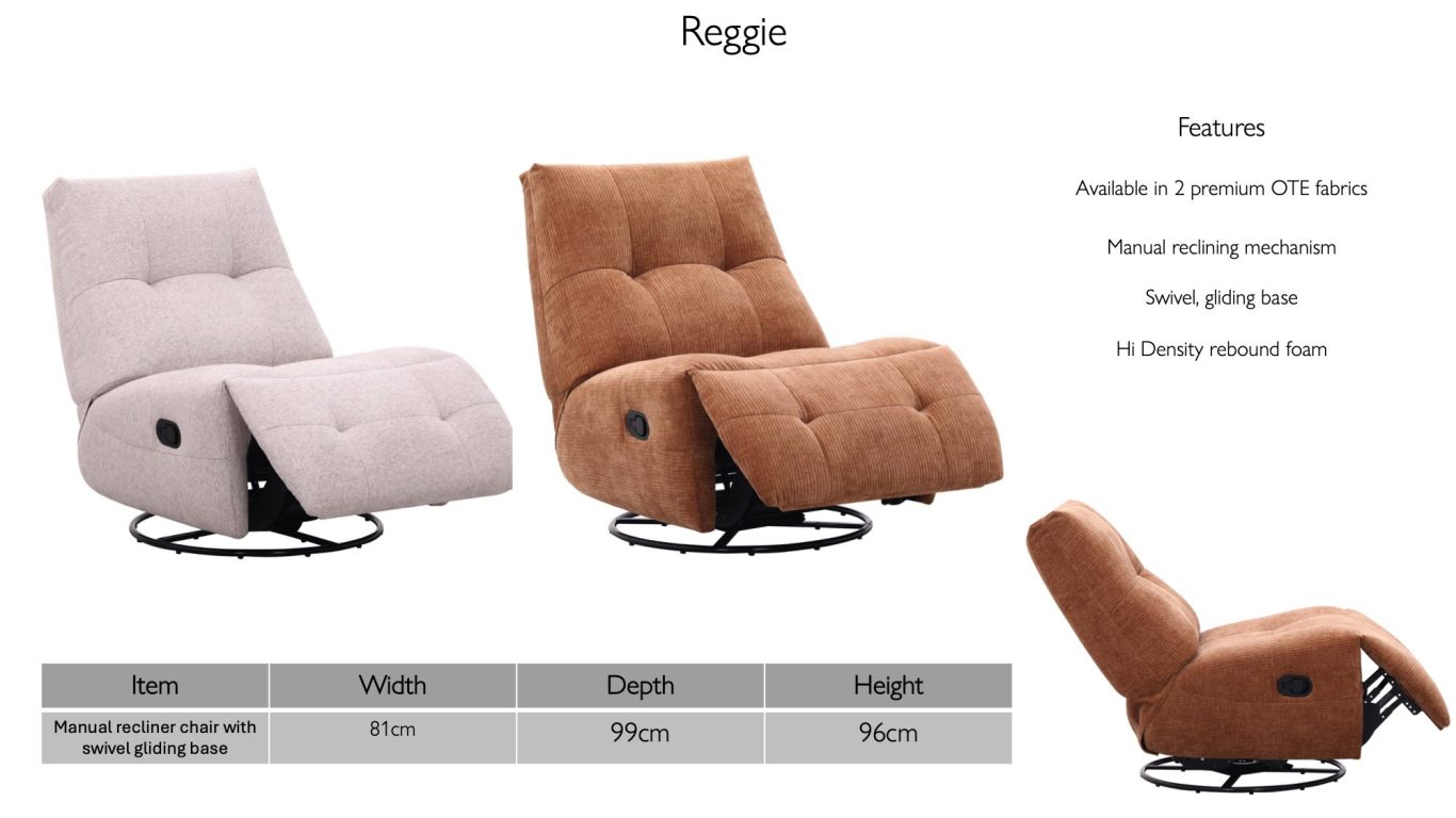 Its manual reclining function flows seamlessly into a swivel gliding base, creating a smooth, soothing motion that turns everyday relaxation into a small ritual of calm. At its core, Reggie is built for indulgence, featuring a high‑density rebound foam interior that delivers supreme comfort and lasting support.